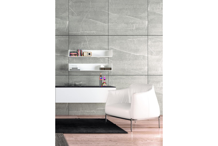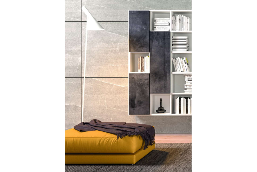 Refined composition with fold-down door and shelves; doors and tops also available in Special Finishes. The side panels of the shelf are wall-mounted with dedicated adjustable brackets.