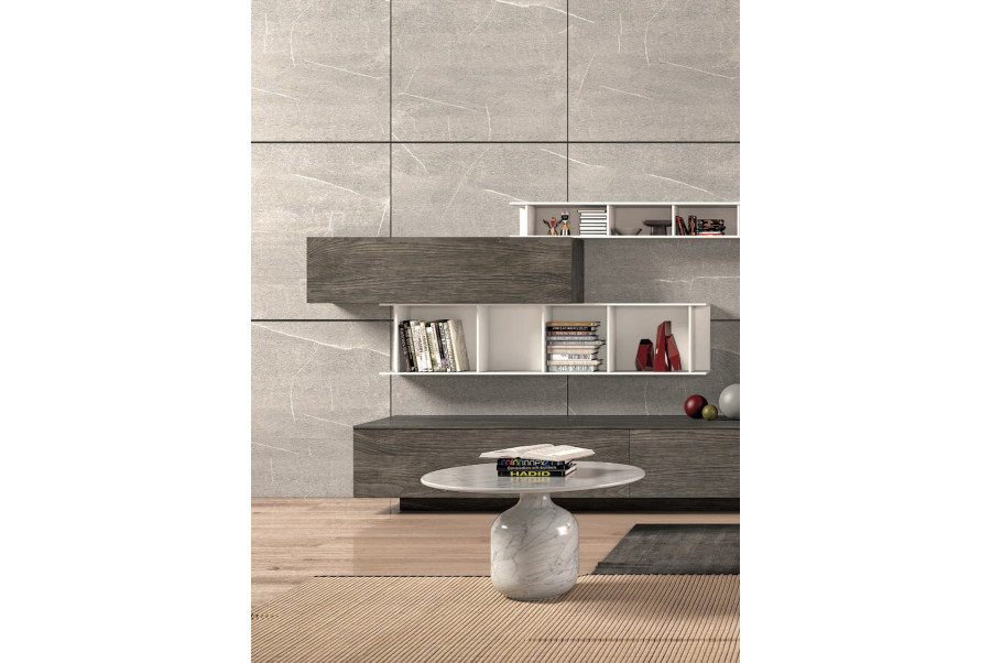 A powerfully harmonious play of colours underpins this composition centred on simplicity and excellent storage features. Libra shelves in two different dimensions with closed pore matt lacquer finish. The skirting board is recessed on the front and side to offer a light suspended effect.