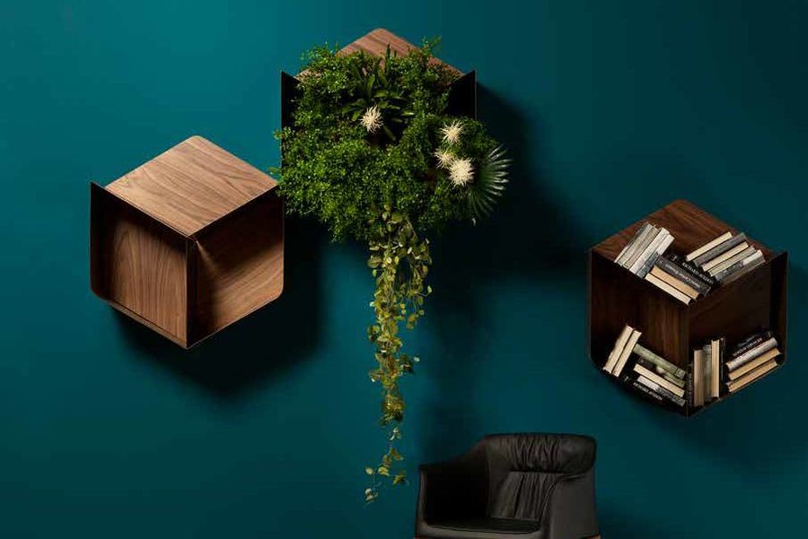 Оригинальные модульные навесные полки Pangea в современном стиле. Задняя стенка может быть выполнена в отделках: орех каналетто, натуральный или темный дуб. Перегородки выполнены в металле в трех цветовых вариантах на выбор.