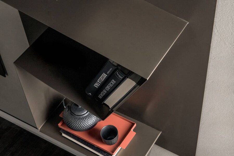 Стильный настенный стеллаж в современном стиле. Металлическая прямоугольная панель дополнена ломанной линией полок. Доступна к заказу в белом, бронзовом или графитовом цвете.