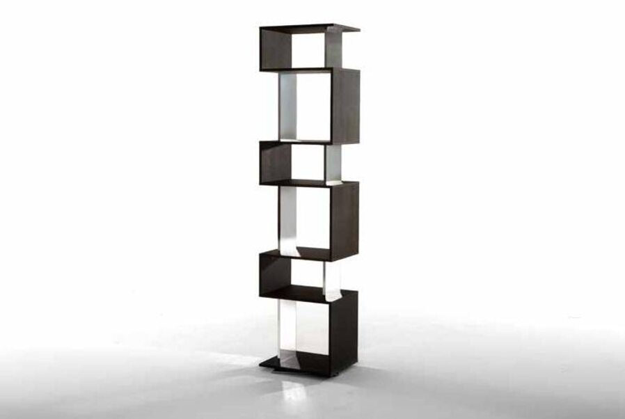 Вращающийся стеллаж выполнен из матового лакированного дерева. Имеет зеркальные декоративные элементы, что придает конструкции еще больше легкости. Доступен в четырех цветовых решениях: белый, черный, орех каналетто или темный дуб.