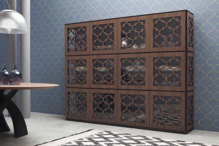 Фасады тумбы под ТВ Marrakesh украшены восточным узором. Вся коллекция представлена в двух цветовых решениях: орех каналетто или темный дуб. Система Marrakech состоит из подставок под ТВ, витрин и подвесных элементов разных размеров.