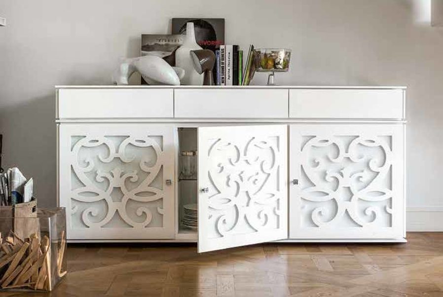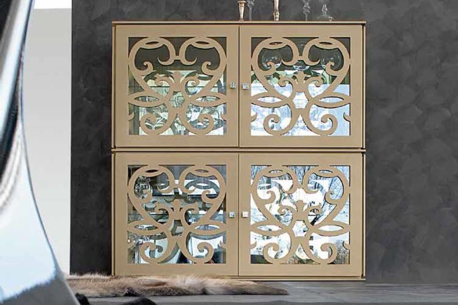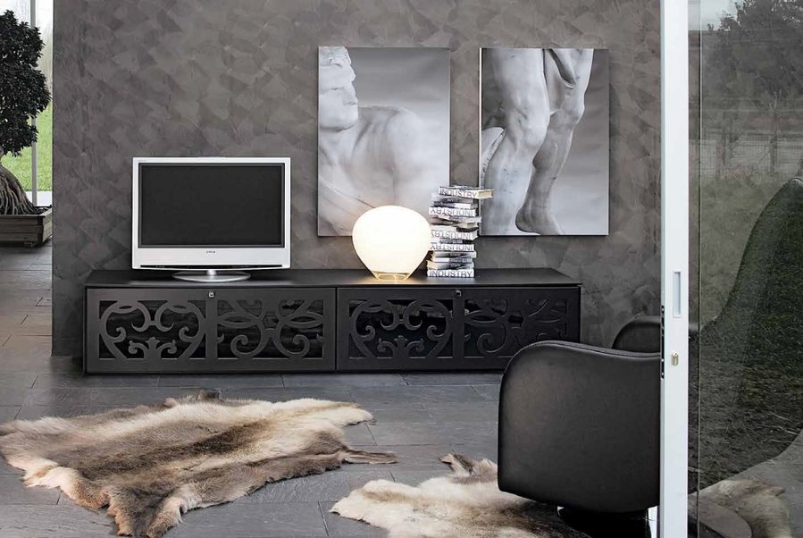 Фасады тумбы под ТВ Paris украшены резным ажурным декором. Материалы: матовое лакированное дерево в комбинации со стеклом. Опционально - led подсветка. Система Paris состоит из подставок под ТВ, витрин и подвесных элементов различных размеров. Цветовое решение можно выбрать по образцам фабрики.