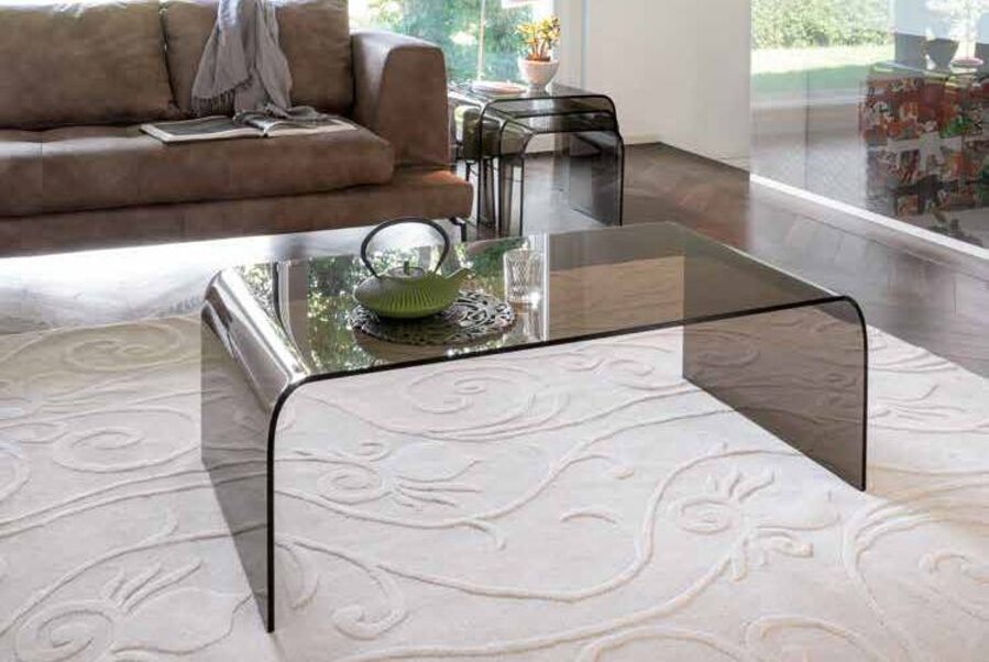 Стеклянный столик Anemone представлен в трех вариантах: прямоугольный из гнутого стекла, маленький компактный с дополнительной полкой для хранения и целый комплект из трех простых столиков. Есть несколько цветовых решений.