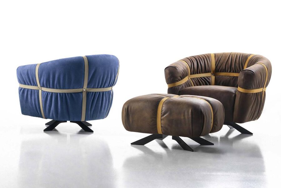 Оригинальный кожаный диван в современном стиле. Кожаные ремни замысловато переплетены, подчеркивая элегантный силуэт корпуса. Этот модульный диван допускает подбор цветовых сочетаний с кожей подушек и ремней.