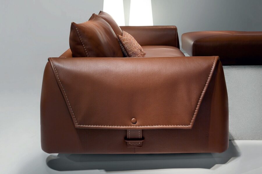 "Изюминкой" данной модели дивана в современном стиле является его подлокотник. Дизайнер фабрики взял за основу форму сумки и стилизовал под нее подлокотник. Особый комфорт дивану придает глубокая посадка. Модель доступна в различных вариантах отделки.