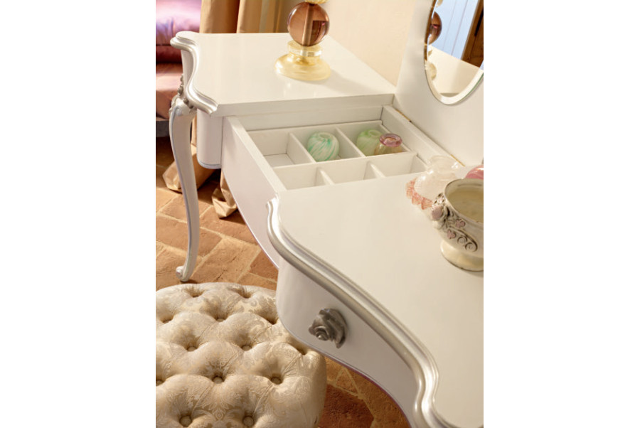 Итальянский туалетный столик Capri фабрики Volpi выполнен в классическом стиле. Изящно изогнутые ножки кабриоль дополнены столешницей с открывающимся зеркалом. Фабрика предлагает большой выбор отделок.