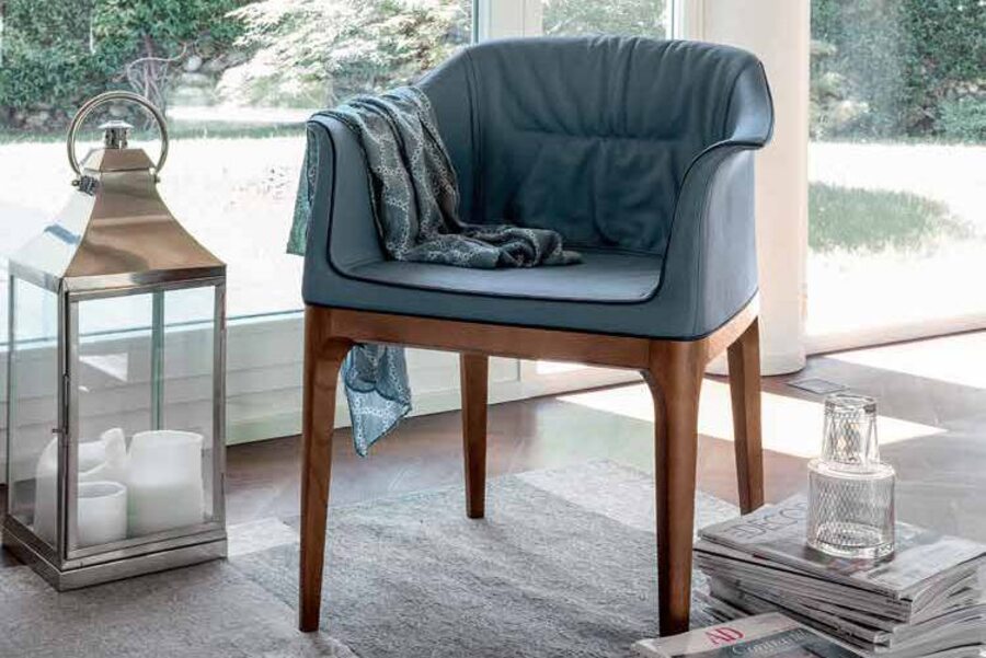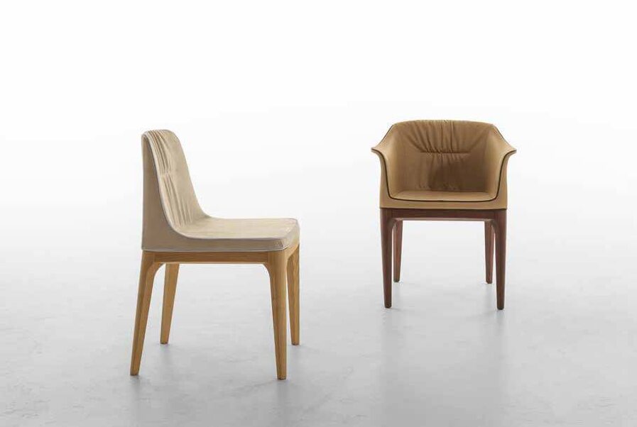 Изысканный стул от дизайнера Angelo Tomaiuolo. Каркас из массива дерева в отделках: орех каналетто, темный или натуральный дуб. Широкий выбор обивки из натуральной кожи, нубука или эко-кожи с богатой цветовой гаммой.